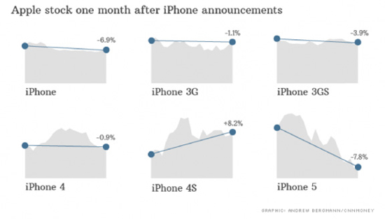 Для того, чтобы понять, что происходит с ценными бумагами Apple после презентаций, предлагаем взглянуть на инфографику CNN Money. На графиках показано, как реагировал рынок на анонсы эппловских смартфонов. После показа большинства iPhone акции резко падали в цене. В то же время в преддверии релиза iPhone 6 стоимость ценных бумаг Apple достигла рекордного значения за всю историю компании. Одни только слухи о предстоящем анонсе смогли разогнать яблочную машину до небывалых скоростей.
