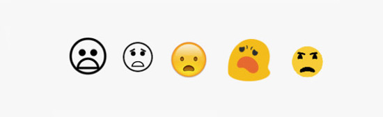 Эмодзи ниже — не шокированный или расстроенный, как может показаться, а хмурый. Официально он называется «нахмурившееся лицо с открытым ртом» («Frowning Face With Open Mouth»). Чтобы прояснить ситуацию, в Unicode предлагают прикрыть смайлу рот и дорисовать угрюмые брови.