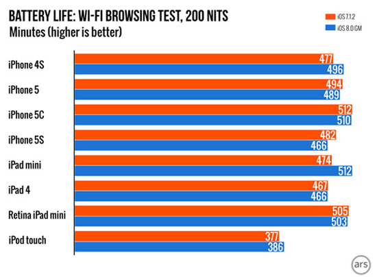 Тесты ArsTechnica показали, что большинство моделей на прошивке iOS 8 действительно «живут» меньше, чем на iOS 7.1.2. К примеру, время серфинга на iPhone 5s сократилось с 482 до 466 минут, а на iPhone 5 – с 494 до 489 минут. В то же время на некоторых старых устройствах автономность даже выросла. К примеру iPad mini первого поколения работает в режиме серфинга на iOS 8 почти на 40 минут дольше: 474 минуты на iOS 7.1.2 против 512 минут на iOS 8.