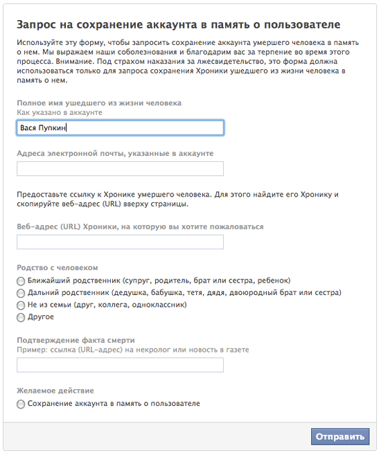 Существует и специальная процедура такого перевода. Родственники, друзья или знакомые (по сути — кто угодно) умершего пользователя социальной сети должны зайти на специальную страницу, заполнить форму и прикрепить ссылку на некролог данному человеку в сети.