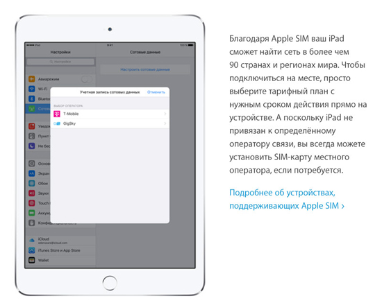 В конце марта Apple провела презентацию, главным анонсом на котором стал новый 4-дюймовый iPhone SE. За презентацией смартфона мало кто обратил внимание на то, что в 9,7-дюймовом iPad Pro, также представленном на том мероприятии, появилась электронная SIM-карта в дополнение к слоту для традиционной «симки». Собственную SIM-карту Apple встраивает в планшеты уже второй год, но ранее это была обыкновенная симка, ее можно было извлечь и выбросить. Теперь же Apple встроила полноценную eSIM непосредственно в электронную начинку планшета. По мнению аналитиков, это подготовка к созданию iPhone с двумя «симками».