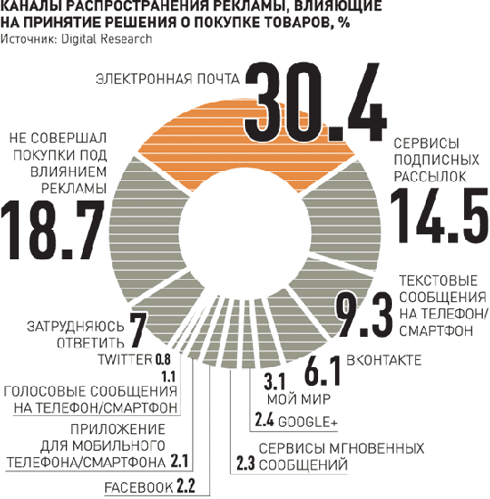 Среди известных и наиболее популярных сегодня каналов коммуникации e-mail оказался не только самым лояльным, по мнению аудитории, каналом для получения сообщений любого типа - рекламных, информационных, сообщений-оповещений, - но и самым эффективным в плане стимулирования к совершению покупки. Об этом свидетельствуют цифры: 30% опрошенных совершают покупки под влиянием рекламы в письмах (для сравнения: по SMS - 9,3%, ВКонтакте - 6,1%, Facebook - 2,2%). Такие данные опубликованы в совместном исследовании компании SubscribePRO, Digital Research и FutureBit.