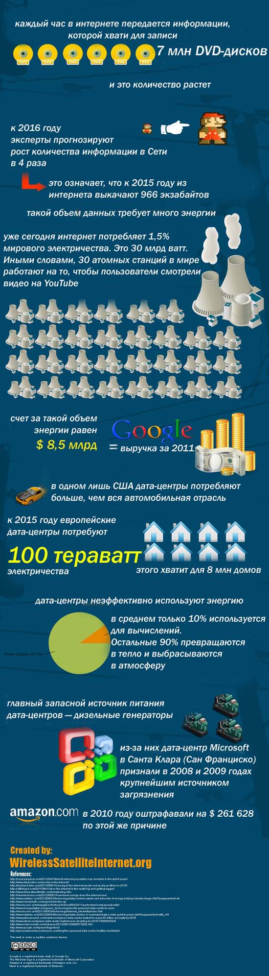Каждый поисковый запрос и каждое просмотренное видео в мировой Паутине – это ватты потраченного электричества. Современный интернет растет быстрыми темпами: сейчас им пользуются 2,4 млрд человек, но в 2007 году доступ в Сеть имели 1,2 млрд пользователей. На поддержку мировой сетевой инфраструктуры уже сегодня уходит 1,5% мирового электричества. А к 2015 году эта цифра вырастет в три раза. Больше интересной информации о том, чем питается привычный сегодня интернет, можно узнать из инфографики компании Wireless Sattelite Internet (по клику на изображении откроется полноформатная версия).