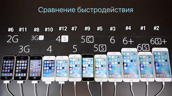 Ресурс EverythingApplePro подготовил 6-минутный ролик, в котором сравнивается скорость работы всех поколений смартфонов Apple, начиная с первой модели iPhone 2G и заканчивая новейшими iPhone 6s Plus. Цель видео — продемонстрировать, как изменились дизайн и производительность смартфонов Apple.