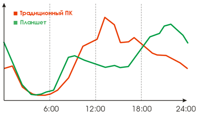 В то же время традиционный ПК остается главным рабочим инструментом, и аналитики не предвидят смены парадигмы в условиях офиса. На вопрос «Где вы пользуетесь планшетом?» большинство владельцев отвечают «дома» или «в общественных местах». Опрос относительно использования устройств с привязкой ко времени суток также наглядно демонстрируют «вечерний» характер пользования планшетами. А с 10 до 18 часов, т.е. в рабочее время, длится период властвования традиционного ПК.