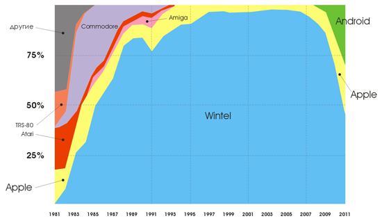 Звезда платформы Wintel, доминировавшей на рынке последние два десятилетия, закатывается. Данные: Asymco, Gartner, IDC.