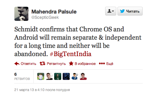 После ухода Энди Рубина с поста главы Android в «Лабораторию Икс», в сети началось обсуждение дальнейшей судьбы мобильной операционной системы. Многих смутило, что к работе над Android приступил глава подразделения Chrome, причем он будет совмещать новую и старую должности. Появились рассуждения, что Android и Chrome OS могут пойти на сближение и трансформироваться в новый продукт. Эрик Шмидт, глава Google, сегодня пообещал, что они не будут класть яйца в одну корзину. Два подразделения и две операционные системы продолжат существовать независимо друг от друга.