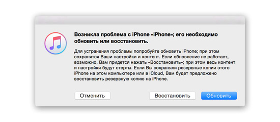 Если устройство смогло загрузиться, iTunes покажет всплывающее окно с сообщением о том, что программное обеспечение устройства необходимо обновить или восстановить.