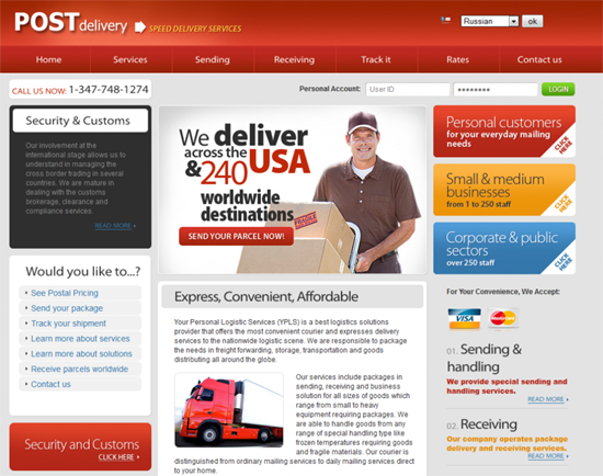 Для этого создаётся подставной сайт, где жертва оплачивает доставку. Для пущей убедительности, от имени курьерской службы высылается электронное сообщение со ссылкой на сайт транспортной компании, где указывается логин и пароль для доступа в “личный кабинет”, номер посылки, её вес и имя получателя.
