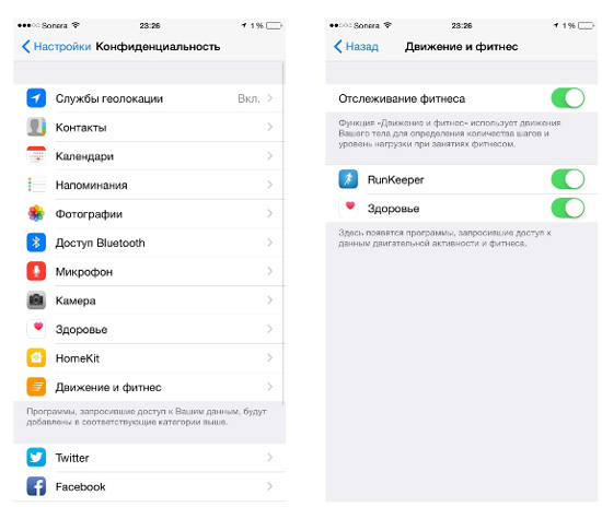 -В пункте “Движение и фитнес” перевести переключатель “Отслеживание фитнеса” в положение “выключено”.