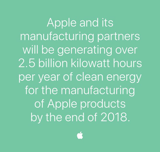 В Apple заявили, что к концу 2018 года еще три ее китайских партнера полностью перейдут на возобновляемые источники энергии при производстве комплектующих для iPhone. Речь идет о компаниях Compal Electronics, Sunwoda Electronic и Biel Crystal Manufactory. В своем письме агентству Синьхуа вице-президент Apple по охране окружающей среды Лиза Джексон отметила, что «в свете продолжающихся усилий компании в сфере возобновляемых источников энергии, мы очень рады работать бок о бок с китайскими партнерами, чтобы содействовать зеленому будущему Китая».