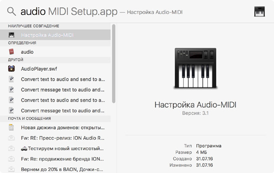 Для этого в системе есть встроенное приложение Audio MIDI Setup. Открыть его можно при помощи поиска Spotlight — так будет быстрее всего.