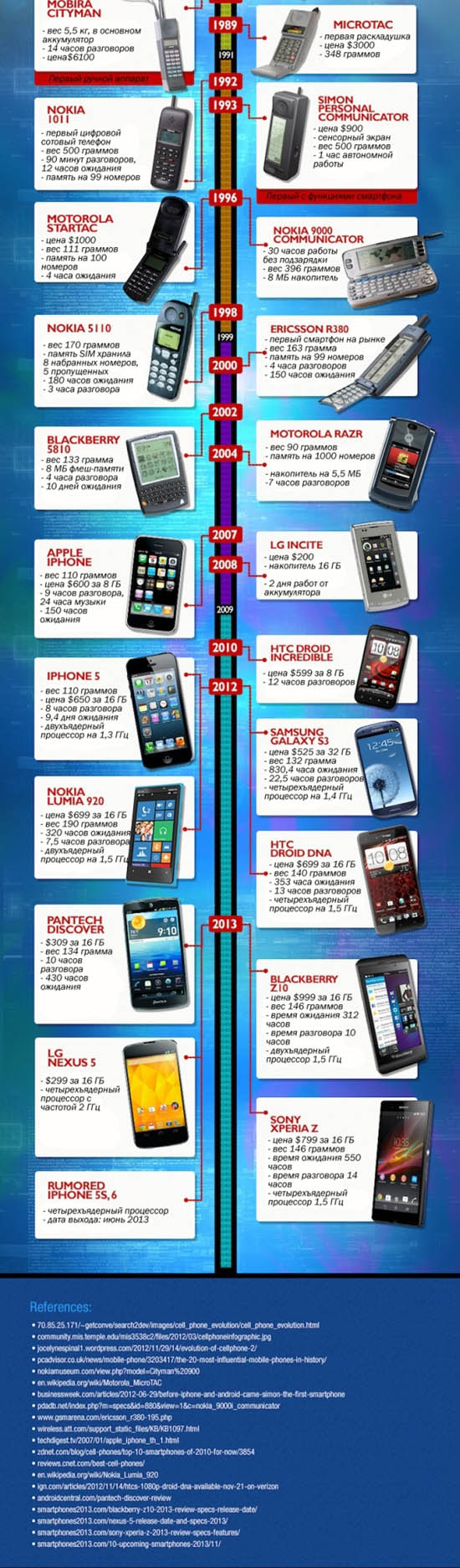 Мы привыкли, что сотовые — это миниатюрный компьютер в кармане, который умеет очень многое. Но раньше телефоны были совсем не такими, как сегодня. С момента своего появления, 31 год тому назад, они прошли большой путь развития. От многокилограммовых монстров до компактных универсальных гаджетов. Эксперты издания The Next Web показали всю историю эволюции мобильников на инфографике, а мы ее перевели на русский :