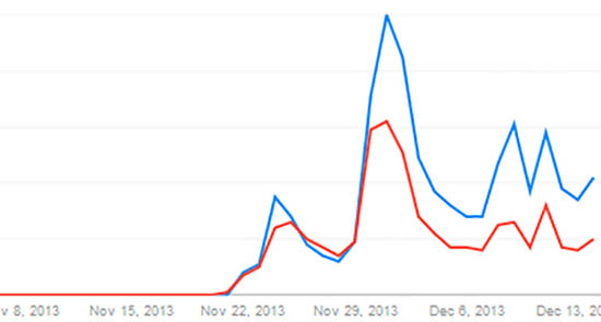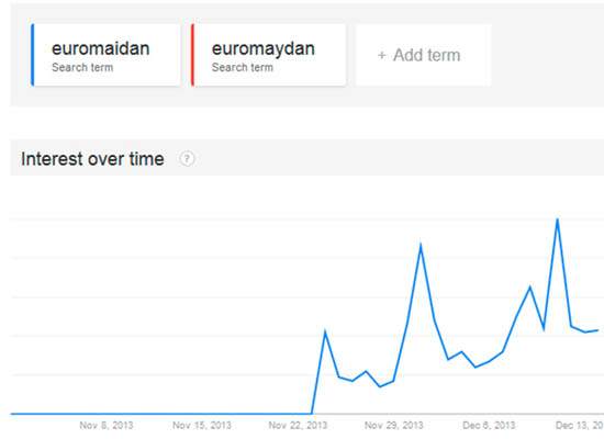 Для примера того, как работает этот подход, давайте рассмотрим общий график поискового спроса в Google по запросам «евромайдан» (синим цветом на графике ниже) и «євромайдан» (красным цветом).