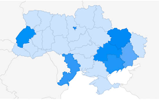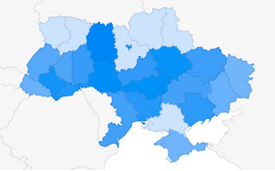 Теперь рассмотрим, как интерес к теме распространялся по Украине. Для этого используем карту Google с отображением динамики спроса по регионам.