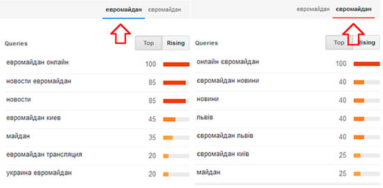 Ниже представлены таблицы, показывающие наиболее интересные темы для пользователей Google по запросам «евромайдан» и «євромайдан».