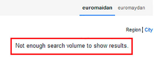 Но при попытке посмотреть географию запросов и наиболее важные темы внутри группы ключевиков «euromaidan» и «euromaydan», мы видим техническое сообщение, что уровень запросов слишком мал, чтобы предоставить данную информацию. Такое в Google наблюдается только при крайне малом количестве поисковых запросов.