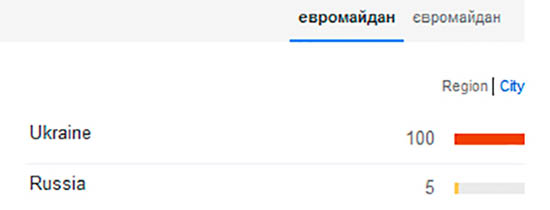 Аналогичная ситуация и с аналитикой поисковых запросов из России. По условной шкале Google, где украинский уровень спроса берется за 100%, Россия и ее уровень спроса по данной теме — не более 5% от украинского уровня. Причем замер проводится исключительно по русскому варианту слова «евромайдан», чтобы не понижать статистику за счет украино-язычных запросов, которых в России нет. На примере ниже можно увидеть сопоставление Украины и России по количеству поисковых запросов «евромайдан».