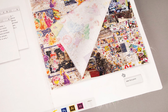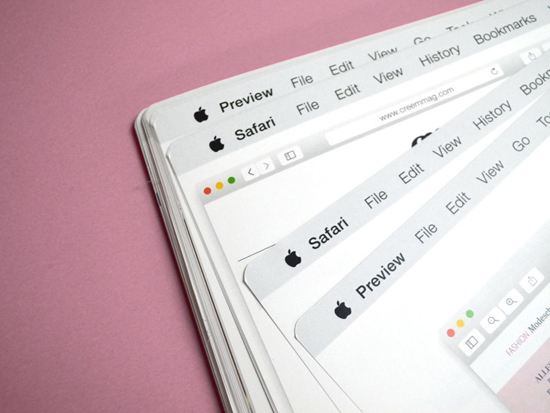 Первая страница оформлена как экран входа в систему OS X с фотографий дизайнера и паролем. Внутри «MacBook» – несколько десятков страниц с работами художницы. Каждая выглядит как рабочий стол Mac. Есть строка состояния и окно того или иного приложения. Внизу док-панель с иконками. В доке подсвечивается пиктограмма, которая непосредственно связана с работой – Safari, Photoshop, Adobe Illustrator и т.д.