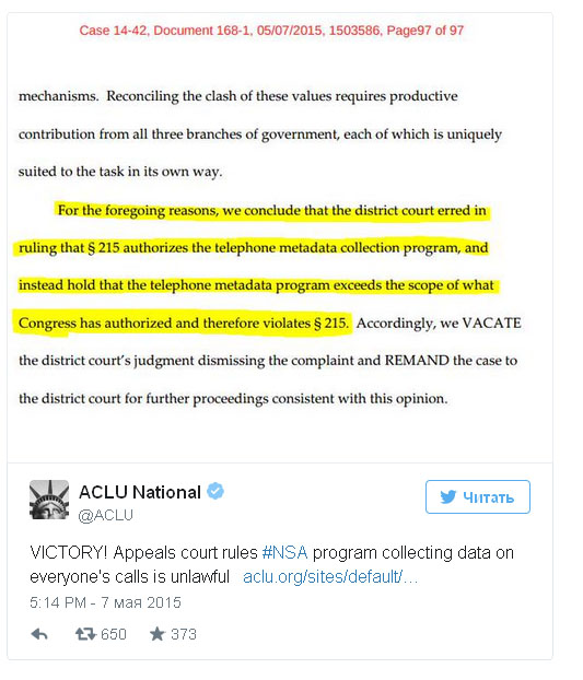 Впервые ACLU обратилась в нижестоящий суд в 2013 году, однако тогда их иск отклонили. Теперь суд средней инстанции признал то решение недействительным, а программу телефонной слежки — незаконной.