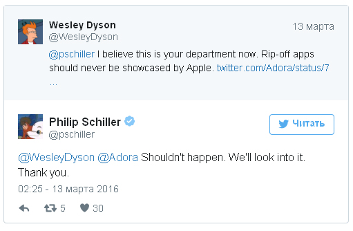 Фил Шиллер, который с декабря несет ответственность за работу магазинов приложений Apple, включая App Store, отреагировал на призыв в Twitter и пообещал разобраться в проблеме. Ранее мы уже говорили о мерах, которыми Фил Шиллер постарается сделать App Store более привлекательным и полезным для разработчиков и пользователей.