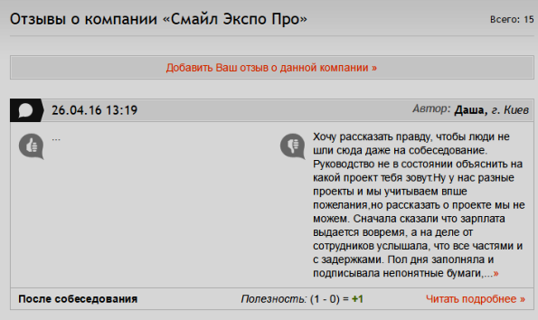 На двух страницах портала опубликованы негативные комментарии о работе с "Смайл-Экспо". Их вероятно оставили бывшие сотрудники компании и приходившие на собеседование кандидаты на различные вакансии (к примеру, ныне украинский офис ищет специалиста технического отдела, менеджера проекта, SEO-специалиста).