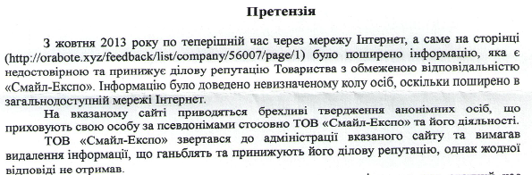 В письме директор украинского офиса требует от интернет-провайдера заблокировать доступ абонентов к веб-порталу "О Работе", на котором размещаются отзывы о работодателях. По мнению руководства "Смайл-Экспо", ресурс распространяет недостоверную и порочащую деловую репутацию компании информацию.