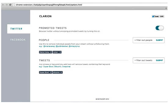 Нередко даже самые интересные люди публикуют в твиттере сообщения на посторонние темы, которые вам совершенно не интересны: результаты матчей своей любимой команды или политические лозунги. Расширение Clarion позволяет очистить ленту от всей чепухи.