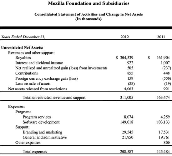 Организация Mozilla огласила финансовые результаты за 2012 год. К сожалению, диверсифицировать источники дохода организации не удается. Совсем наоборот: в очередной раз увеличилась финансовая зависимость от компании Google, которая в прошлом году обеспечила 90% всех доходов Mozilla. Годом ранее этот показатель составлял 85%.