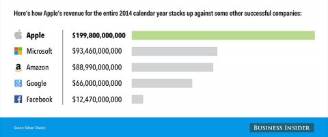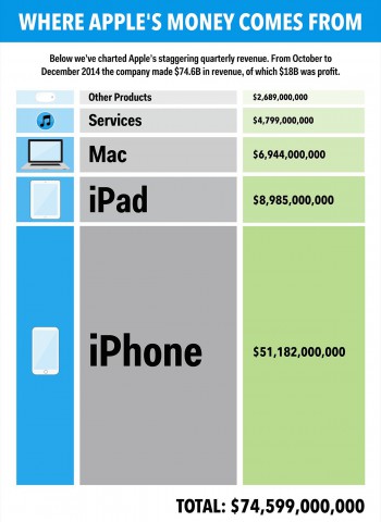 В прошлом месяце компания Apple отчиталась о своих доходах за четвёртый квартал 2014 года. Корпорация побила все мыслимые рекорды: её чистая прибыль составила 18 миллиардов долларов. Таким образом, корпорация побила рекорд российской компании Газпром. Это связано как и с огромным спросом на продукцию гиганта из Купертино, так и с повышением стоимости iPhone 6, флагманского продукта компании. Так, средняя стоимость смартфона от Apple по сравнению с прошлым годом выросла на $50 и составила $687. Издание Business Insider опубликовало инфографику, демонстрирующие финансовые успехи Apple.