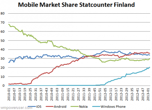 Statcounter сообщает, что рост доли Windows Phone в области мобильного трафика произошел за счет уменьшения доли iOS и Android. Последняя до сих пор лидирует в Финляндии, в то время как iOS вторая, а решения Nokia – третьи.