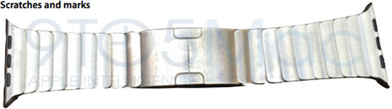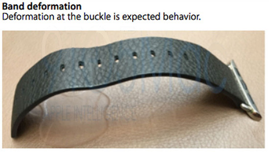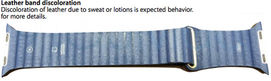 Apple приводит фотографии ремешков со следами использования. Так, на голубом браслете заметны потертости и изменения цвета материала. Также кожаные ремешки имеют свойство со временем деформироваться. На блочных браслетах образуются потертости. В Apple подчеркивают, что все это негарантийные случаи и не подпадают под программу возврата или обмена.