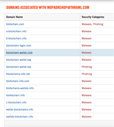 Исследователи OpenDNS заметили, что многие вредоносные сайты хостятся на IP-адресах, которые ранее уже попадали в поле зрения ИБ-экспертов. Поиск по огромной Whois-базе проекта показал, что те же самые IP ранее использовались для хостинга фишинговых сайтов, которые имитировали банковские порталы, iCloud и так далее, а также для рассылки спама. Более того, большинство этих фишинговых доменов зарегистрировано всего на шесть почтовых адресов: mopadrehop@thraml.com, stopracuho@thraml.com, tidrorosti@thraml.com, boatbits@yandex.com, isellbtc@yandex.com и isellbtc1234567@gmail.com.