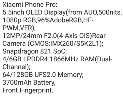 Модель, пока указанная как Xiaomi Phone Pro, получит 5,5-дюймовый FHD-дисплей с OLED-матрицей яркостью до 500 нит, новейший процессор Qualcomm Snapdragon 821, 4 или 6 ГБ ОЗУ LPDDR4, 64 или 128 ГБ высокоскоростной встроенной памяти UFS 2.0, аккумулятор на 3 700 мАч и сканер отпечатков, размещенной на передней панели.