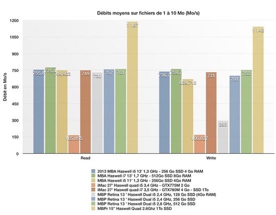 Согласно тестам, скорость записи и чтения составляет более 1 Гбайт/с. На графике наглядно можно видеть, что MacBook Pro Retina 15 значительно вырывается вперед, в среднем опережая предыдущие поколения на 400 Мбайт/с при операциях с чтением и записью.