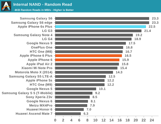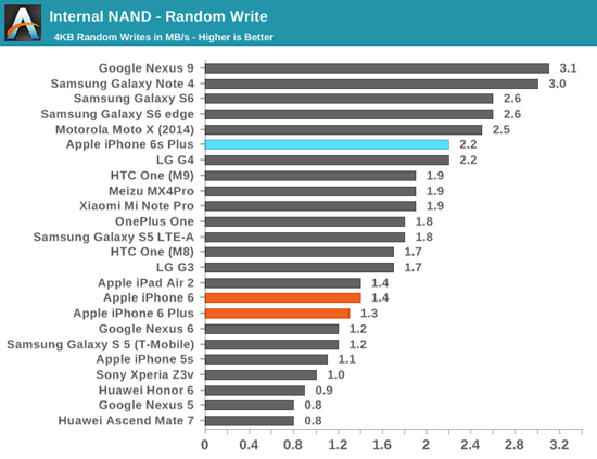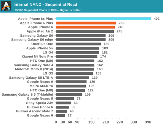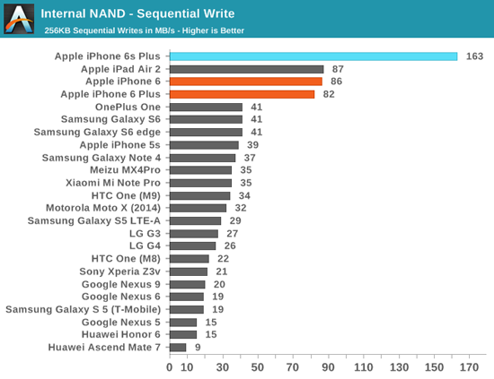 Согласно тестам издания, скорость последовательного чтения памяти iPhone 6s Plus до 50% выше, чем у iPhone 6 Plus – 402 МБ/с против 253 МБ/с. По скорости записи новый флагман вдвое опережает своего предшественника – 187 МБ/с против 87 МБ/с.