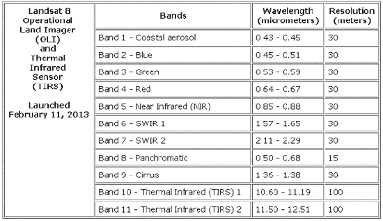 С периодом обращения 99 минут, фотоспутник Landsat 8 покрывает фотографиями всю территорию Земли за 16 суток. Он летает в точности по такой же траектории, как Landsat 5. Заказчики на Земле в течение 12-ти часов получают фотографии в нескольких спектральных диапазонах. Длина волны и разрешение каждого из сенсоров Landsat 8 указаны в таблице.