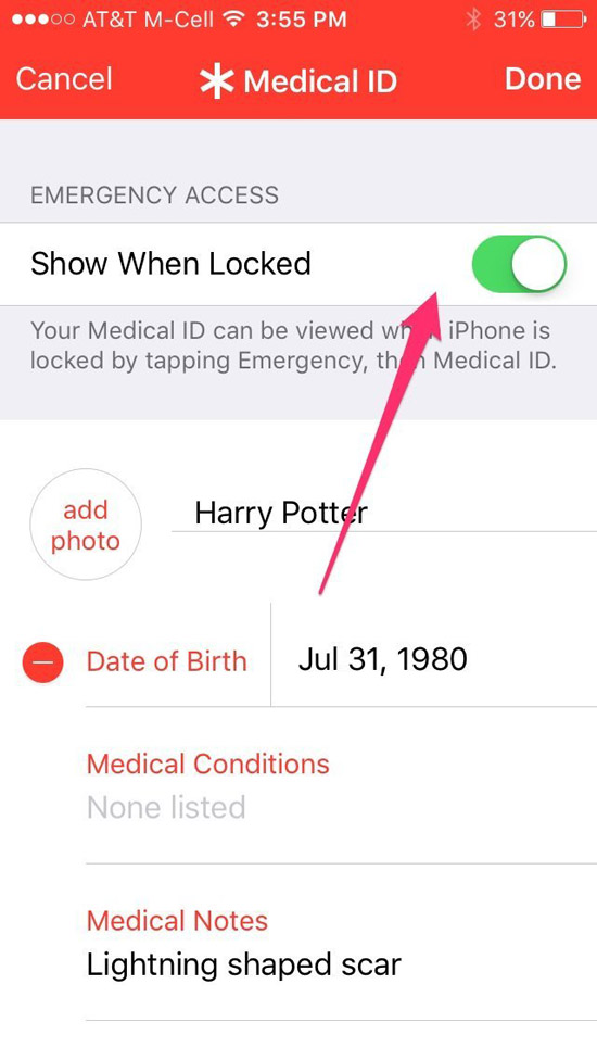 В медкарте можно указать имя, дату рождения, особые приметы, а также добавить свои экстренные контакты. Поскольку все эта информация доступна с экрана блокировки, указывать следует данные, которыми пользователь готов делиться с окружающими.
