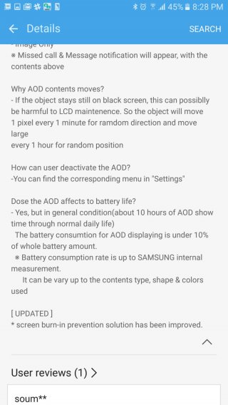 Нам неизвестно какие именно приемы были использованы, но контент перестал перемещаться по всему экрану. Не похоже на то, что это действительно улучшение, но мы подождем и увидим что Samsung сделал для того, чтобы предотвратить выгорание экрана. Разочаровывает тот факт, что компания не добавила новые возможности всегда включенного экрана. Но опять же, Samsung, конечно, начал прислушиваться к своим потребителя, и мы надеемся, что однажды эта функция станет намного более полезной и удобной в использовании.