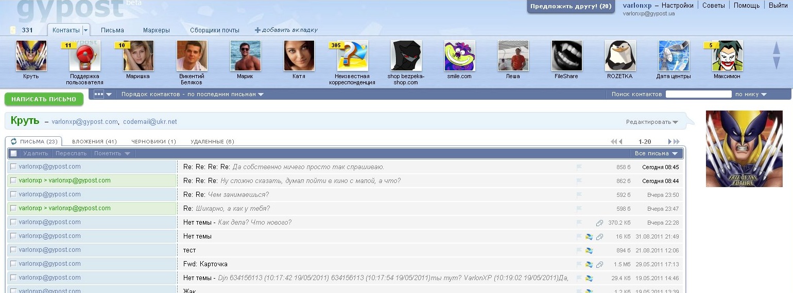 Сервис gYpost.com - инструмент, который в своей основе использует совершенно другой подход в организации корреспонденции, нежели все существующие на данный момент почтовые ресурсы. Здесь пользователь не использует папки и правила сортировки. Он смотрит на свою почту в ящике через специальные фильтры, которые вызывают нужные письма из Вашего ящика на экран монитора. Такие фильтры получили название «Контакты». Они создаются автоматически или по требованию пользователя на основании электронного адреса или группы адресов отправителей или получателей писем. Также контакты являются местом хранения информации о Ваших адресатах – их телефонов и заметок. Как же выглядит интерфейс?