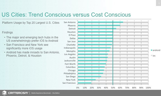 Американцы, проживающие в технологических центрах страны, таких как Bay Area, и крупных городах Нью-Йорк и Сан-Франциско предпочитают пользоваться гаджетами с операционной системой iOS, тогда жители менее благополучных регионов выбирают устройства на платформе Android. Об этом сообщает аналитическое агентство Crittercism со ссылкой на проведенное исследование.