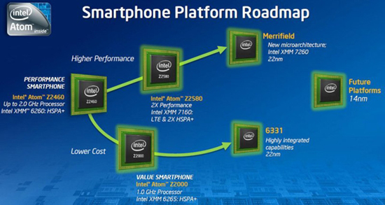 На недавней выставке MWC 2014 в испанской Барселоне Intel представила две новые однокристальные системы Atom Merrifield для планшетов и смартфонов на базе Android. Это 64-битный чип Atom Z3480 с двумя ядрами Silvermont с тактовой частотой до 2,13 ГГц и модель Atom Z3460 с частотой до 1,6 ГГц. Изделия оснащены 1 Мбайт кеш-памяти L2 и графикой PowerVR G6400 @533 МГц.