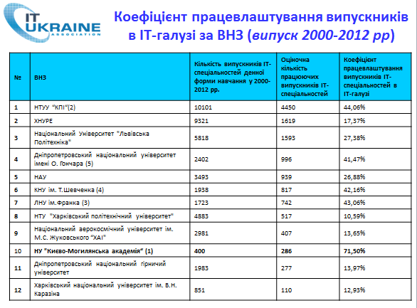 На сегодняшний день, как отмечают эксперты, только 15% выпускников находят роботу по специальности. Владимир Тимофеев, заведующий кафедрой физической и биомедицинской электроники КПИ, отметил, что большое количество украинских ІТ-специалистов не имеют, так называемого профильного образования, но владеют базовыми знаниями, которые может предоставить не каждый вуз. «Четвертая часть ІТ-специалистов Украины окончили главный технический вуз Украины. Около четверти всех выпускников КПИ работают в отрасли ІТ», - сообщил Тимофеев.