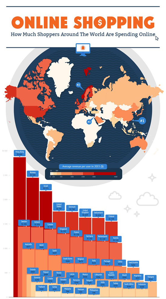 В инфографике, созданной британской аналитической компанией Expert Market, представлен рейтинг стран, жители которых тратят больше всего денег на покупки в интернете (данные на одного жителя за текущий год).