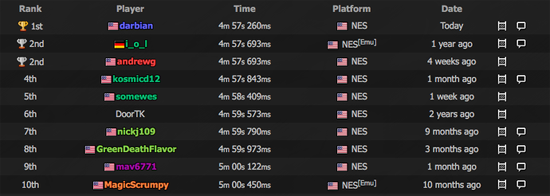 За 31 год существования классической игры Super Mario Bros. в нее сыграли миллионы геймеров разных стран и поколений. А потому неудивительно, что в конце концов лучшие игроки в «Марио» начали соревноваться в скоростном прохождении игры и ставить мировые рекорды. Последний из них принадлежит американскому программисту под ником Darbian, который пробежал всю игру менее чем за пять минут.