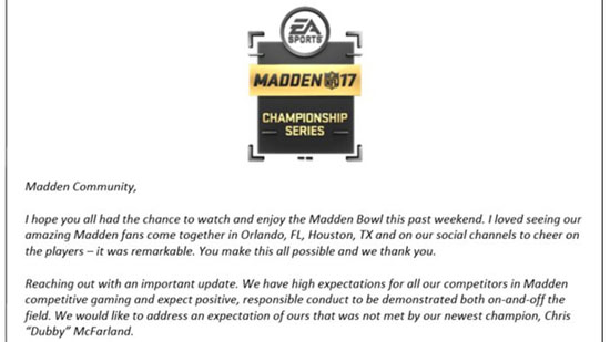 «Эти сообщения нарушили наши нормы поведения и идут вразрез с ценностями нашей организации. Мы незамедлительно связались с Макфарлендом, чтобы предупредить о том, что его сообщения были неприемлемыми», — сообщил Мэтт Марку (Matt Marcou), представитель организаторов соревнований по Madden в EA.