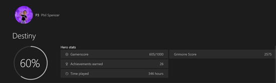 Как недавно сообщила Activision, в среднем на одну учётную запись в Destiny приходится сотни часов. Основным персонажем, за которого играет Спенсер, является Титан максимального 34 уровня. Недавно он также создал Охотника, пока что остановившегося на 14 уровне. Всю эту статистику можно увидеть, изучив профиль главы Xbox на сайте Bungie.
