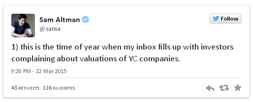 Президент стартап-инкубатора Y Combinator Сэм Альтман (Sam Altman) заявил о переоцененности многих стартапов на начальных стадиях существования проектов. Об этом глава акселератора написал в Twitter.