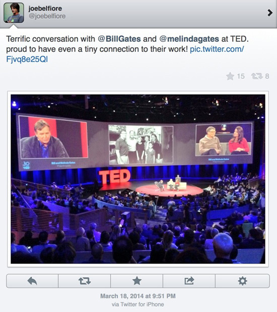 Во вторник в твиттере главы подразделения Windows Phone в Microsoft появилось сообщение, отправленное с iPhone. Случайно или намеренно Джо Бельфиор, отвечающий за смартфоны, планшеты и ПК в Microsoft, опубликовал фотографии четы Гейтсов на конференции TED 2014, сделанные на камеру мобильного телефона Apple.