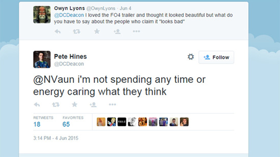 Однако, представители Bethesda не переживают о том, что говорят критики. Несмотря на весьма необычную для постапокалиптического сеттинга палитру красок, глава студии, Пит Хайнс (Pete Hines) откровенно заявил, что ему нет дела до мнения критиков.